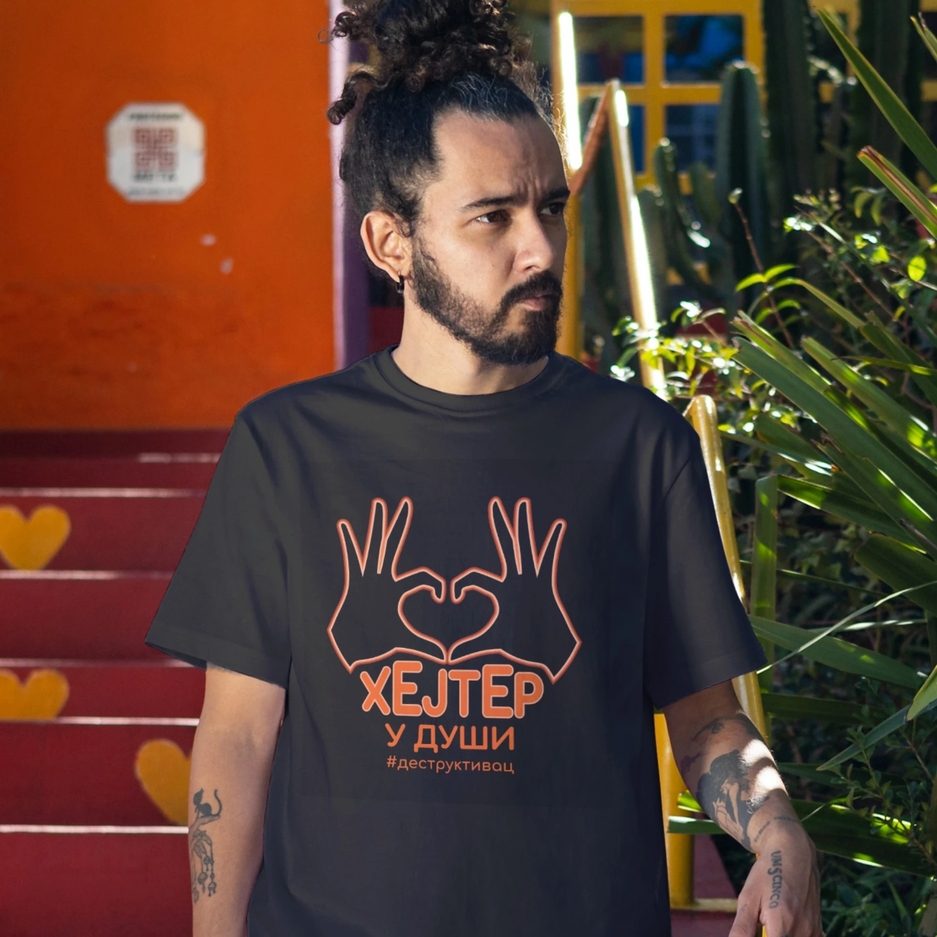 Тараба црна мушка мајица Хејтер у души, са кратким рукавима стандардног regular fit кроја, састава 100% памук. Штампано техником сито штампе. Свака мајица долази са поклон стикерима и флајером са Тараба мотивима, упакована у брендирану Тараба кутију.