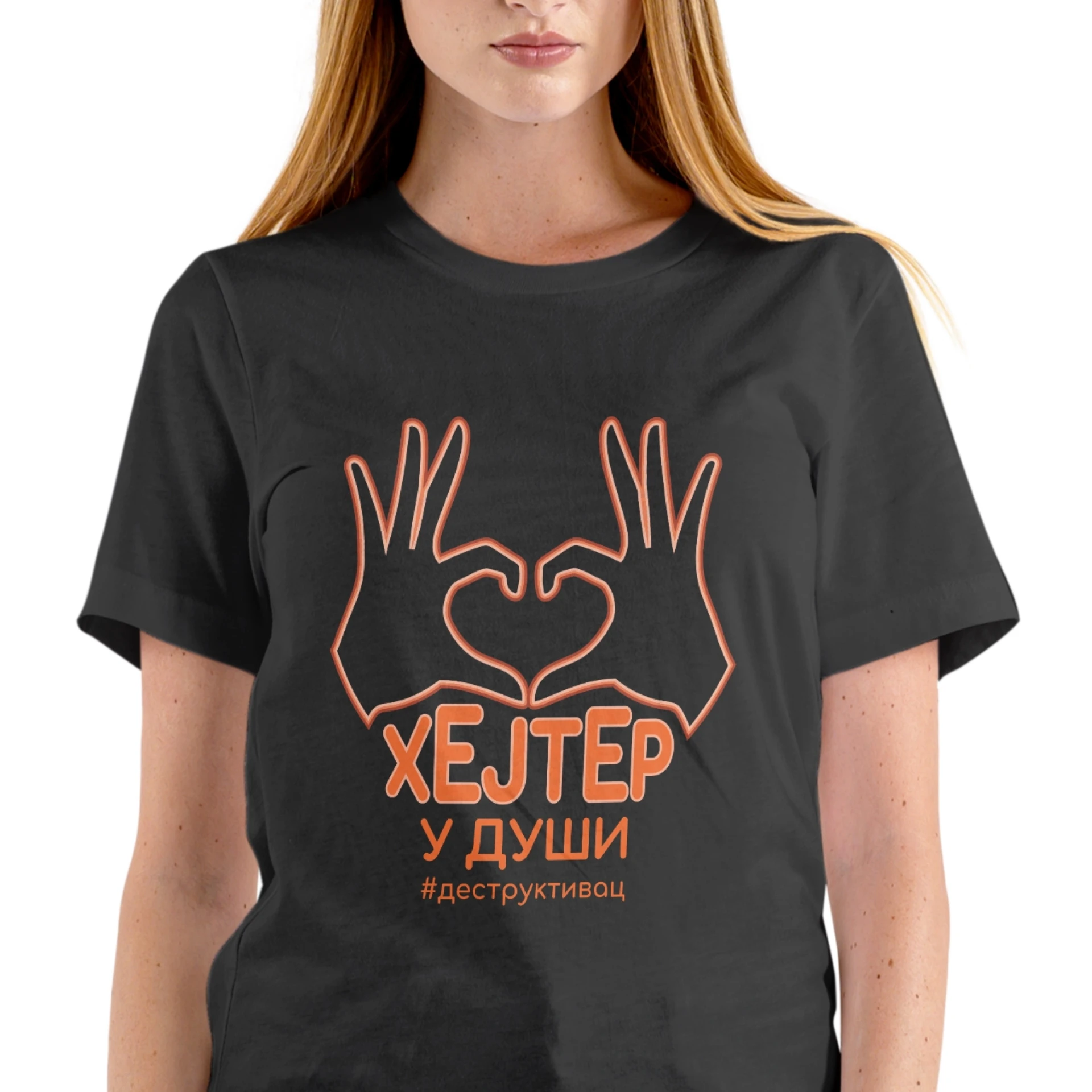 Тараба црна женска мајица Хејтер у души, са кратким рукавима стандардног regular fit кроја, састава 100% памук. Штампано техником сито штампе. Свака мајица долази са поклон стикерима и флајером са Тараба мотивима, упакована у брендирану Тараба кутију.