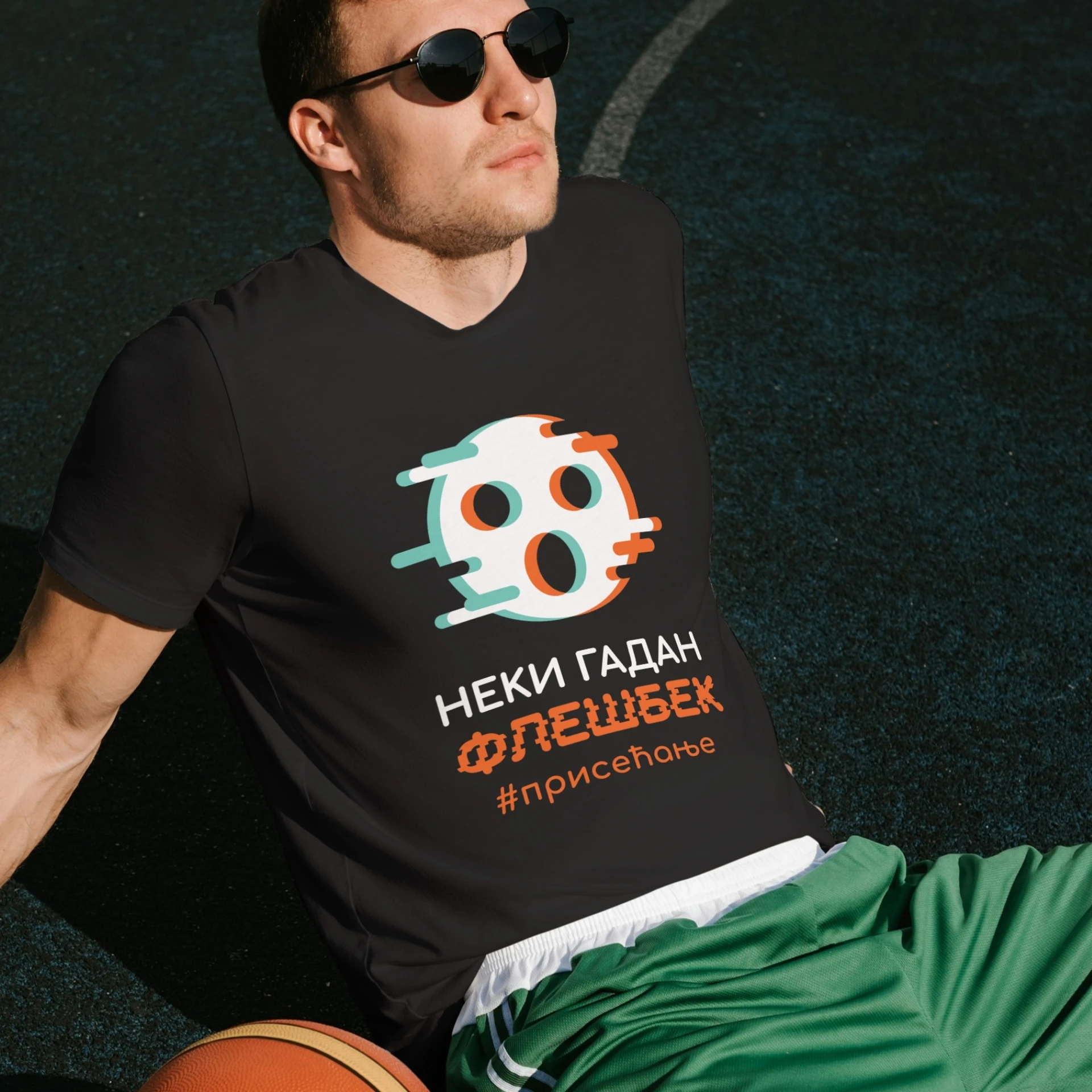 Тараба црна мушка мајица Неки гадан флешбек, са кратким рукавима стандардног regular fit кроја, састава 100% памук. Штампано техником сито штампе. Свака мајица долази са поклон стикерима и флајером са Тараба мотивима, упакована у брендирану Тараба кутију.