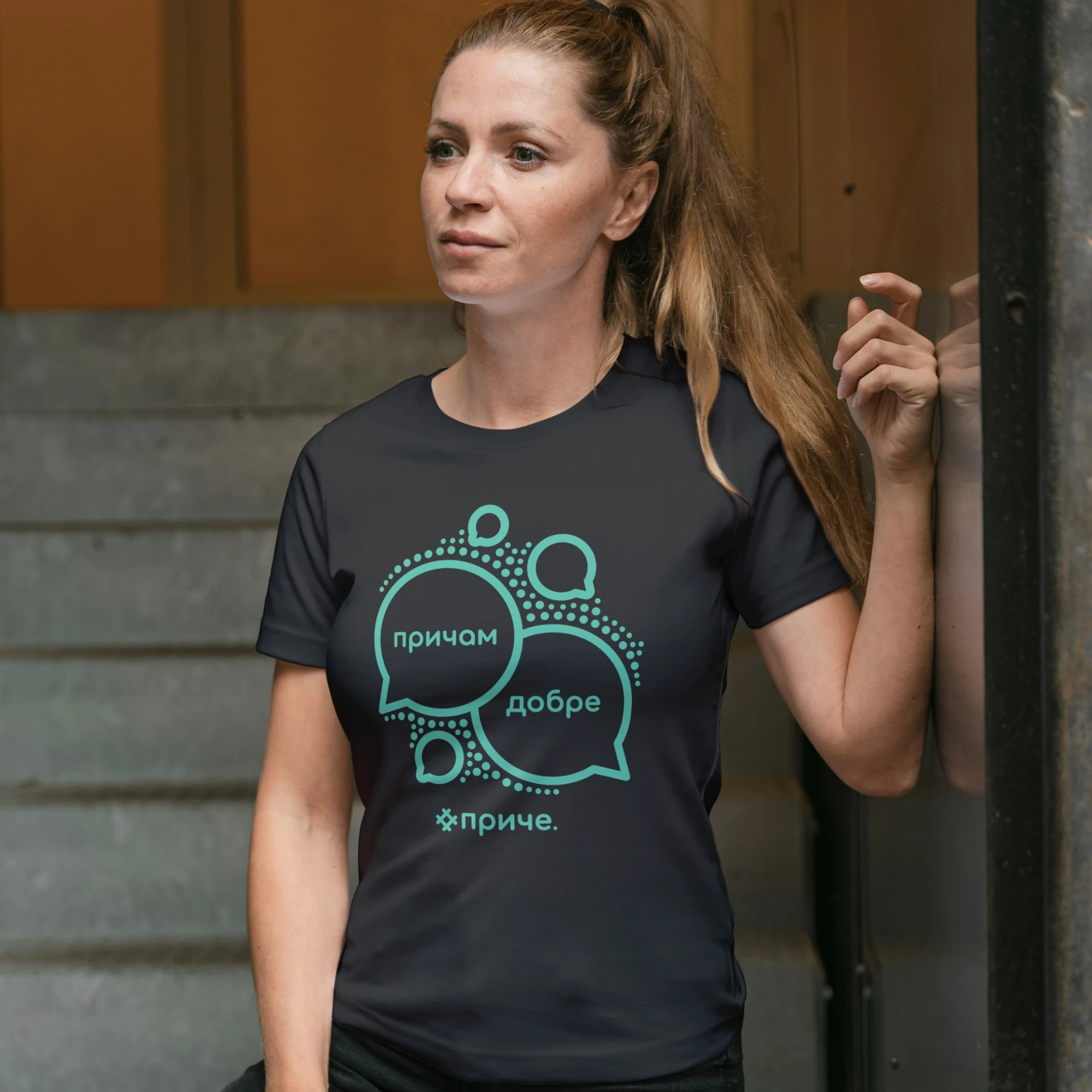 Тараба црна женска мајица Причам добре приче, са кратким рукавима стандардног regular fit кроја, састава 100% памук. Штампано техником сито штампе. Свака мајица долази са поклон стикерима и флајером са Тараба мотивима, упакована у брендирану Тараба кутију.
