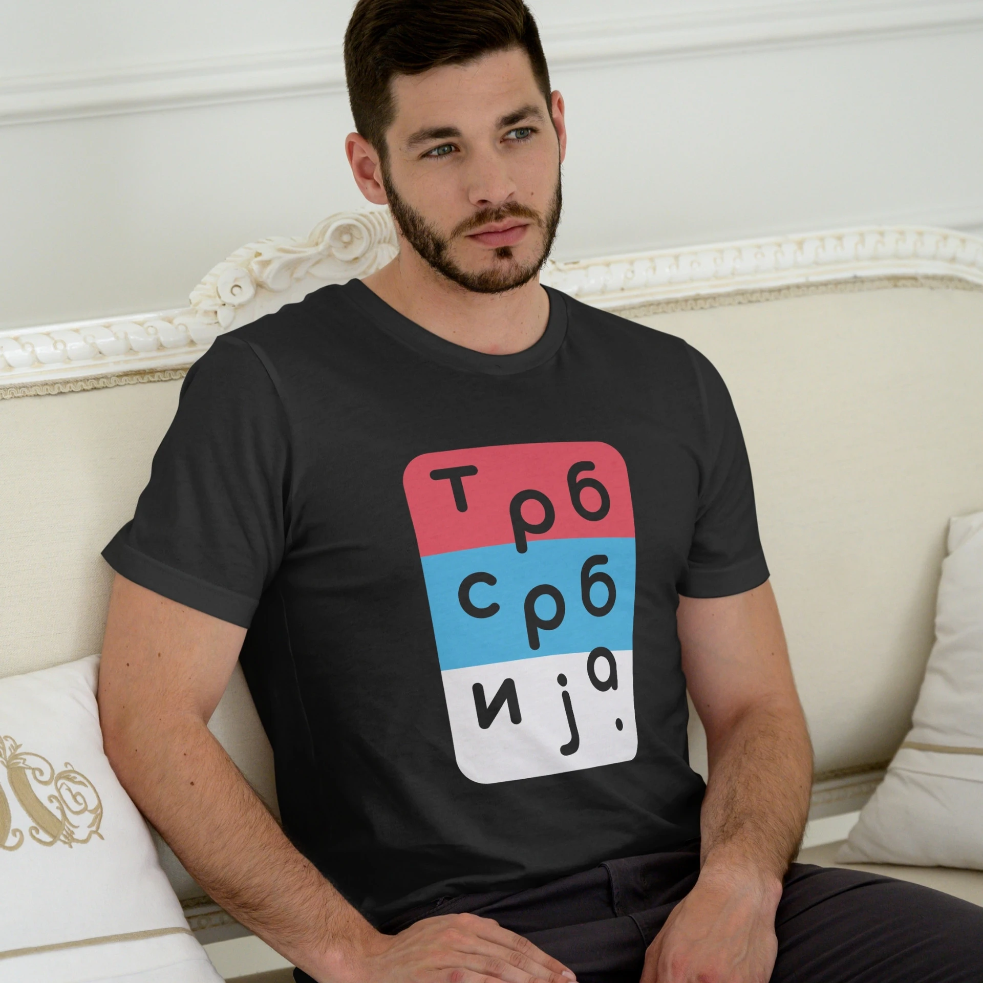 Тараба црна мушка мајица Србија и ја - Тробојка, са кратким рукавима стандардног regular fit кроја, састава 100% памук. Штампано техником сито штампе. Свака мајица долази са поклон стикерима и флајером са Тараба мотивима, упакована у брендирану Тараба кутију.