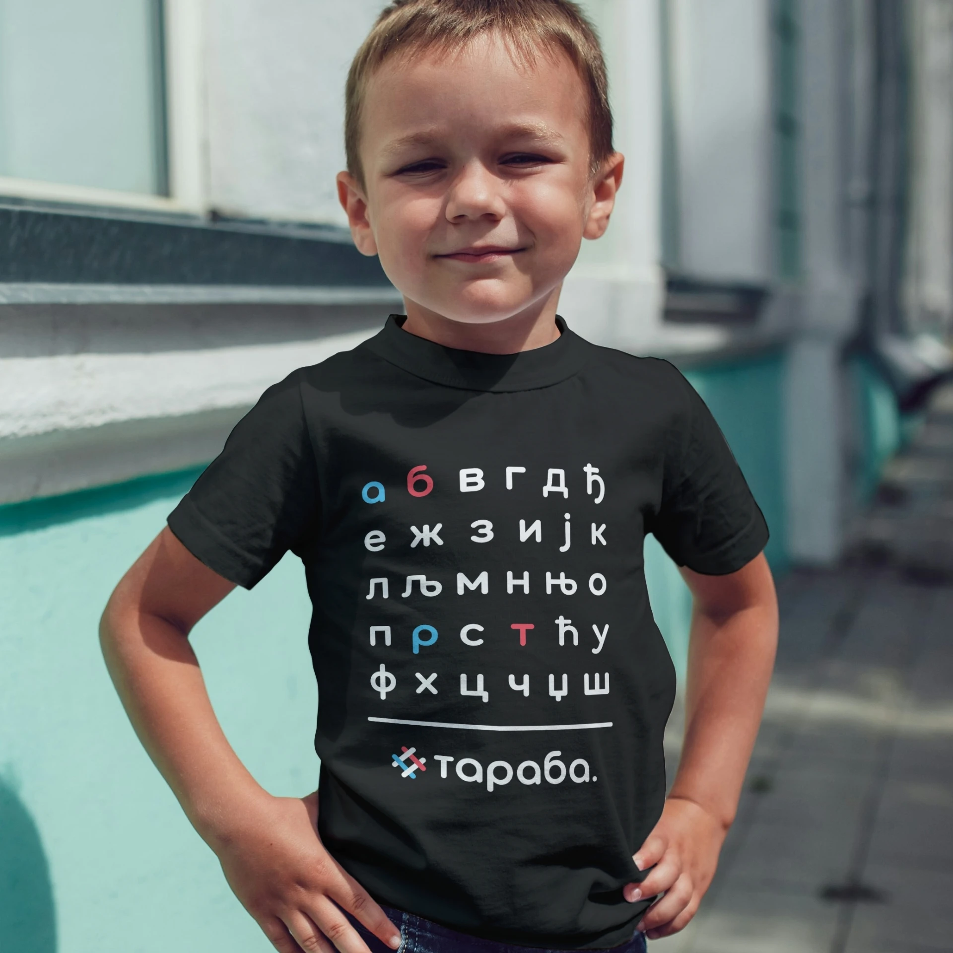 Тараба бела дечија мајица Тараба Азбука, са кратким рукавима стандардног regular fit кроја, састава 100% памук. Штампано техником сито штампе. Свака мајица долази са поклон стикерима и флајером са Тараба мотивима, упакована у брендирану Тараба кутију.