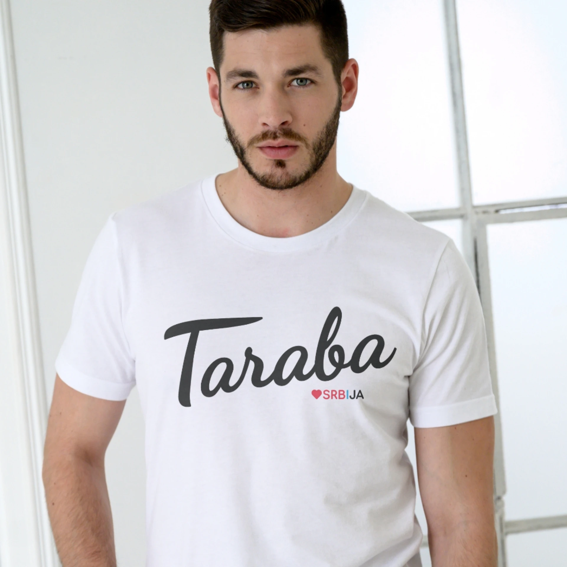 Тараба бела мушка мајица Србија и ја - Латиница, са кратким рукавима стандардног regular fit кроја, састава 100% памук. Штампано техником сито штампе. Свака мајица долази са поклон стикерима и флајером са Тараба мотивима, упакована у брендирану Тараба кутију.