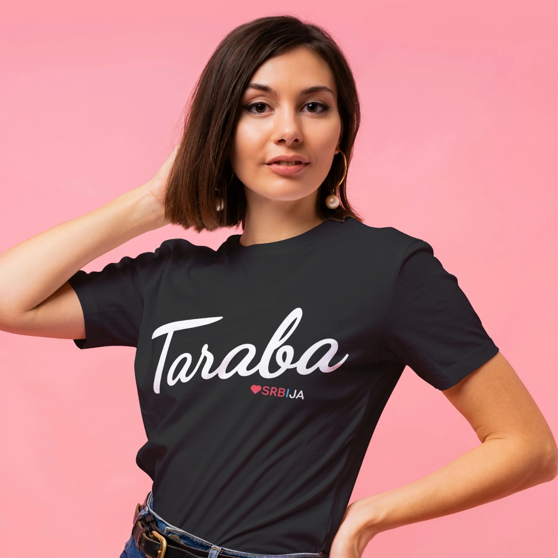 Тараба црна женска мајица Србија и ја - Латиница, са кратким рукавима стандардног regular fit кроја, састава 100% памук. Штампано техником сито штампе. Свака мајица долази са поклон стикерима и флајером са Тараба мотивима, упакована у брендирану Тараба кутију.