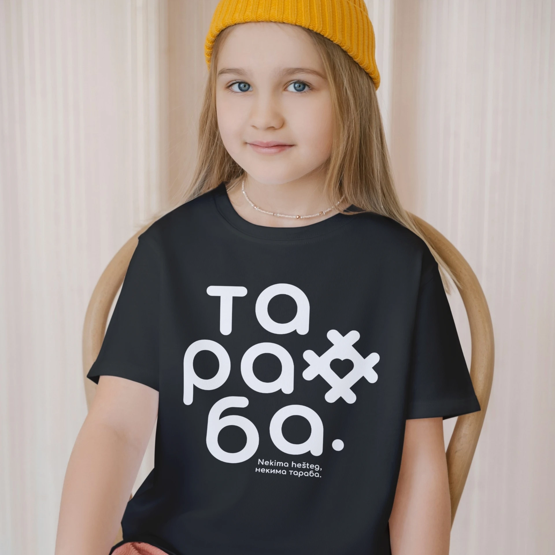 Тараба бела дечија мајица Тараба Стандард 1, са кратким рукавима стандардног regular fit кроја, састава 100% памук. Штампано техником сито штампе. Свака мајица долази са поклон стикерима и флајером са Тараба мотивима, упакована у брендирану Тараба кутију.