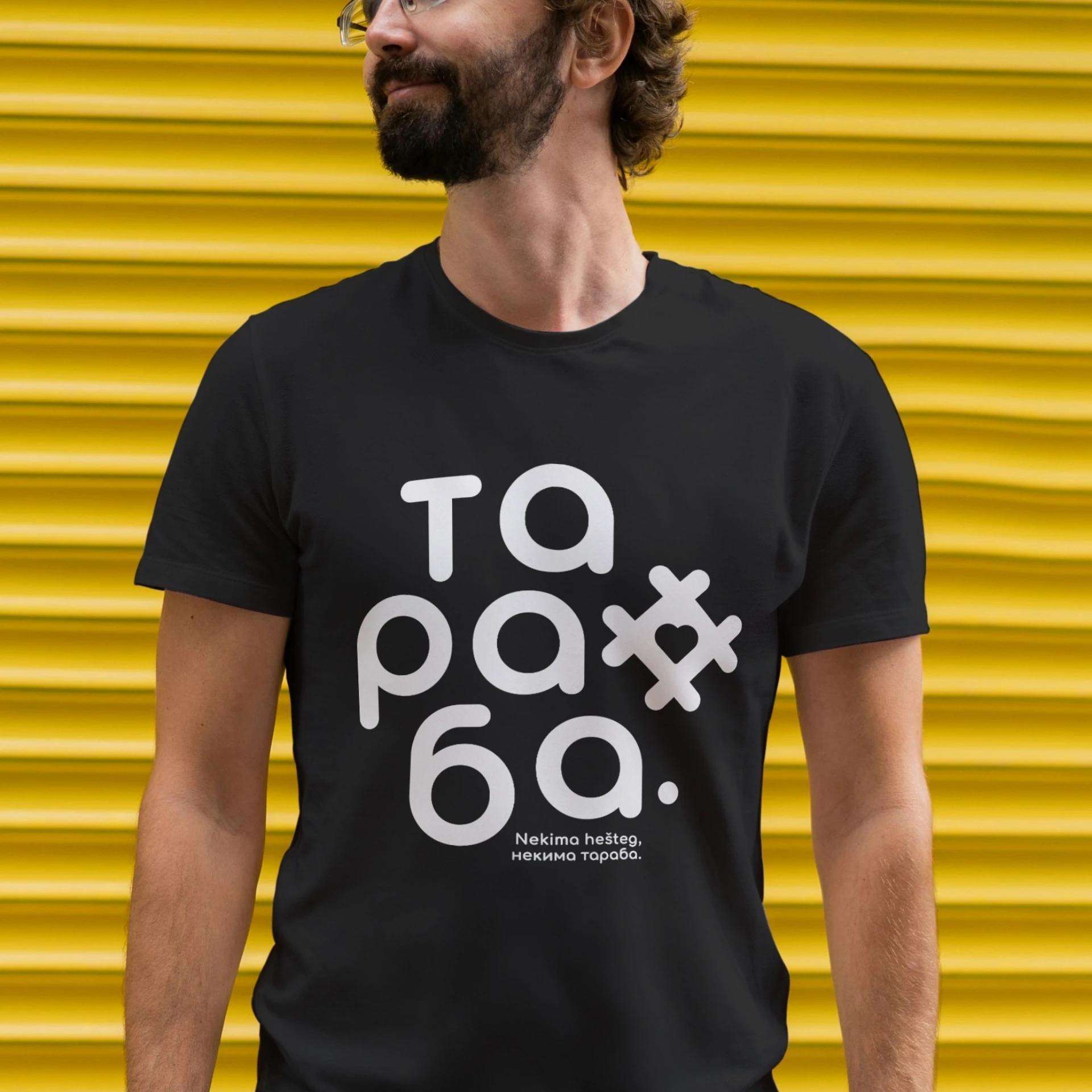 Тараба црна мушка мајица Тараба Стандард 1, са кратким рукавима стандардног regular fit кроја, састава 100% памук. Штампано техником сито штампе. Свака мајица долази са поклон стикерима и флајером са Тараба мотивима, упакована у брендирану Тараба кутију.
