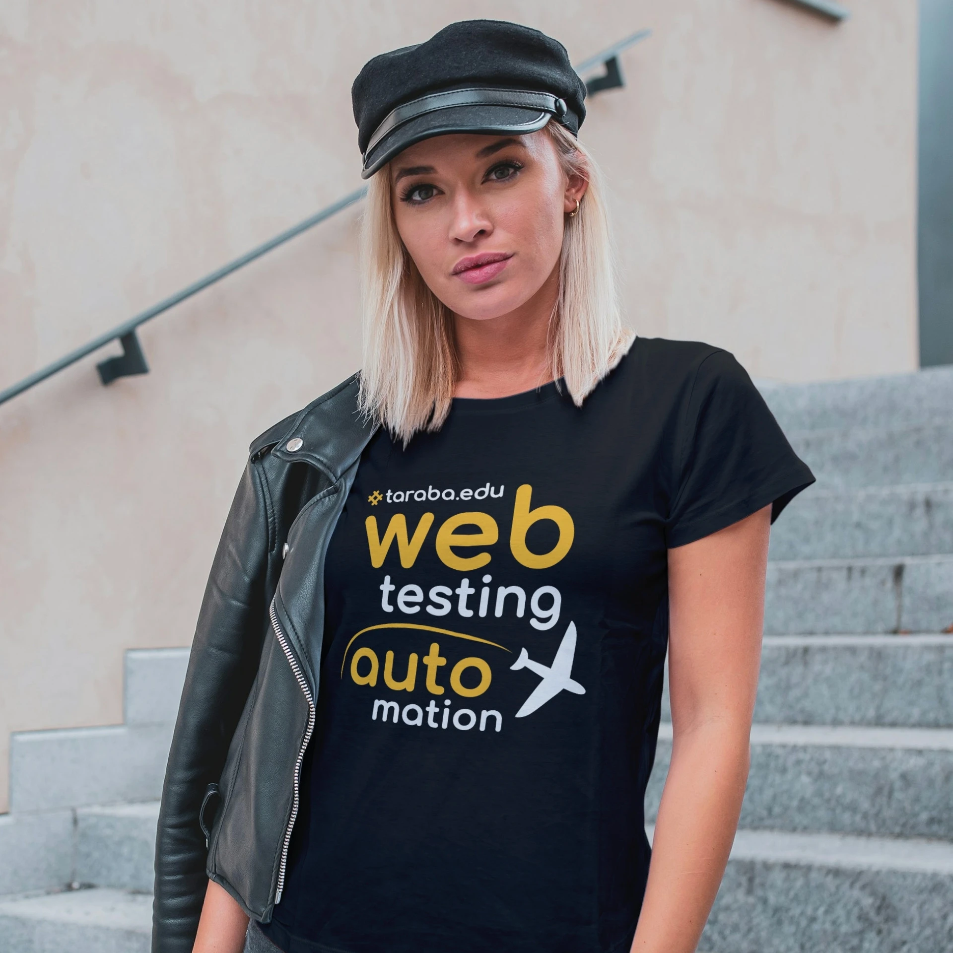 Тараба црна женска мајица Web Testing Automation 24, са кратким рукавима стандардног regular fit кроја, састава 100% памук. Штампано техником сито штампе. Свака мајица долази са поклон стикерима и флајером са Тараба мотивима, упакована у брендирану Тараба кутију.